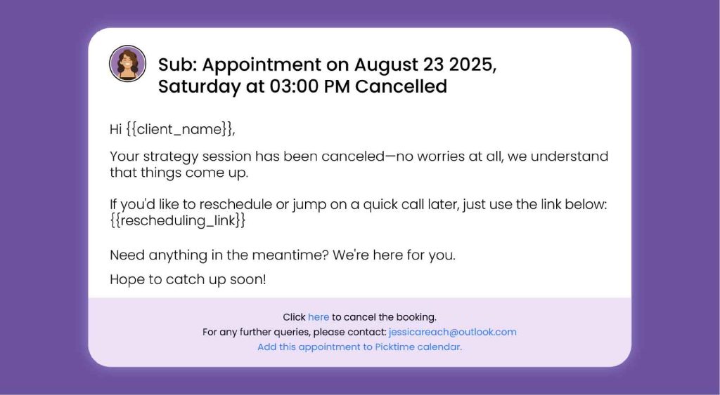Using smart placeholders such as {client_name}, {service_name}, {appointment_date}, and {rescheduling_link}, Alex quickly personalizes the message. The email now addresses the client by name, clearly mentions the session they booked, and includes a direct link to choose a new time—all without writing the email from scratch.