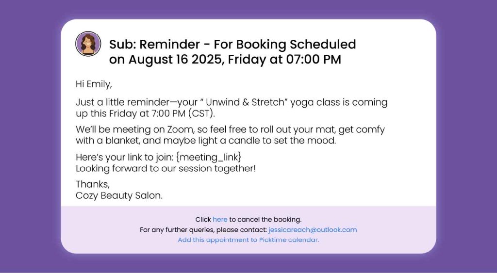 Jessica knows this well. She offers scheduled classes and manages everything through Picktime. Once a student books a session, she makes sure they receive a friendly reminder before the class begins.