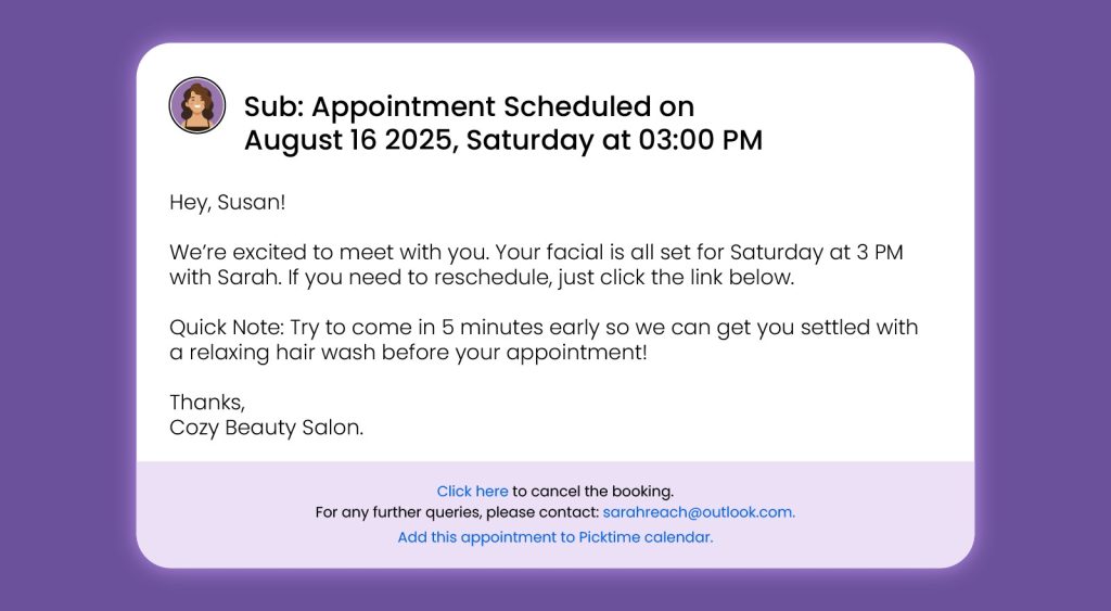 With an appointment scheduling software like Picktime, you’ve got the freedom to make your emails feel just right. You might be wondering, how can personalizing each email actually improve the customer experience? So we pulled together a few relatable scenarios you’ve probably come across every day. The best part? We’re not just showing them out—we’ve got easy fixes for you, too.